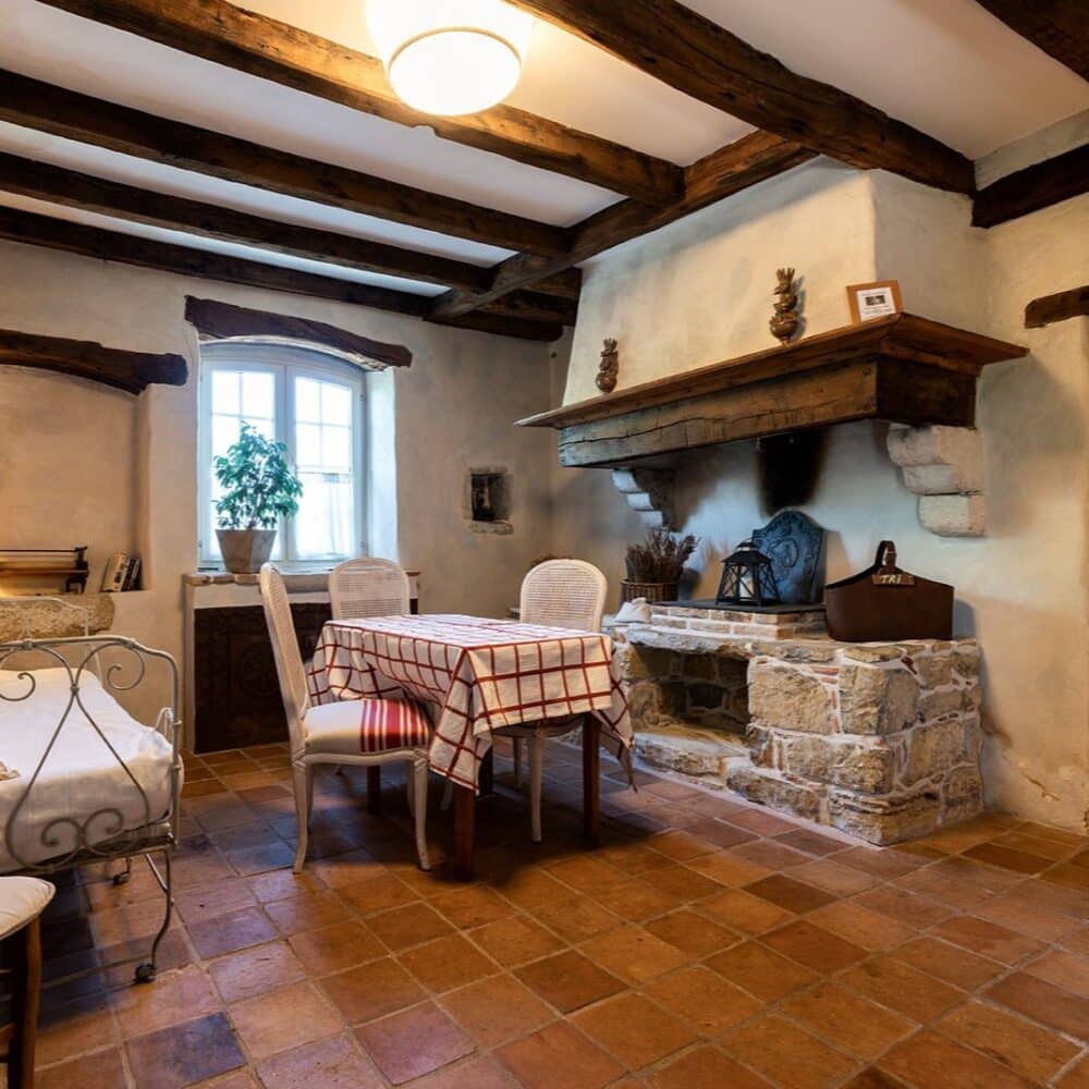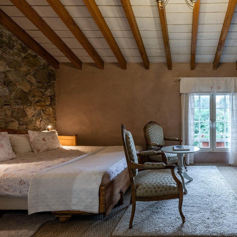 Charme authentique et atmosphère romantique se mêlent dans notre Chambre Luxe, avec son mur en pierre, ses poutres apparentes et sa salle de bain au charme d’antan.